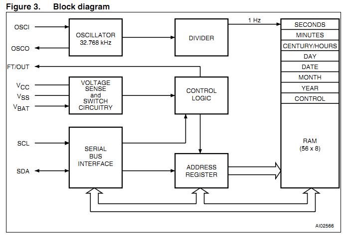 The M41T56M6F is a low power, serial real-time clock with 56 bytes of NVRAM. A built-in 32,768Hz oscillator (external crystal controlled) and the first 8 bytes of the RAM are used for the clock/calendar function and are configured in binary coded decimal (BCD) format. Addresses and data are transferred serially via a two-line, bidirectional bus. The M41T56M6F built-in address register is incremented automatically after each WRITE or READ data byte. The M41T56M6F clock has a built-in power sense circuit which detects power failures and automatically switches to the battery supply during power failures. The energy needed to sustain the RAM and clock operations can be supplied from a small lithium coin cell.