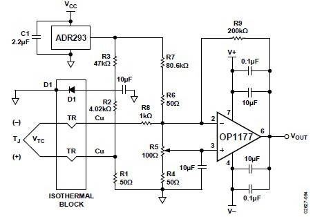 The OP2177ARZ consists of very high precision, single, dual, and quad amplifiers featuring extremely low offset voltage and drift, low input bias current, low noise, and low power consump-tion. Outputs are stable with capacitive loads of over 1000 pF with no external compensation. Supply current is less than 500 μA per amplifier at 30 V. Internal 500 Ω series resistors protect the inputs, allowing input signal levels several volts beyond either supply without phase reversal. Unlike previous high voltage amplifiers with very low offset voltages, the OP2177ARZ (dual) amplifier is available in tiny 8-lead surface-mount MSOP and 8-lead narrow SOIC packages. The OP2177ARZ offers the widest specified temperature range of any high precision amplifier in surface-mount packaging. It is fully specified for operation from -40℃ to +125℃ for the most demanding operating environments.