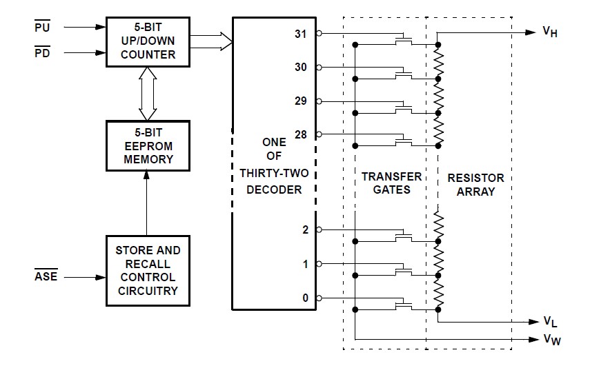The X9511WP is a single push button controlled potentiometer. The Intersil X9511WP is a push button controlled potentiometer that is ideal for push button controlled resistance trimming. The X9511WP is a resistor array composed of 31 resistive elements. Between each element and at either end are tap points accessible to the wiper element. The position of the wiper element is controlled by the PU and PD inputs. The position of the wiper can be automatically stored in E2 memory and then be recalled upon a subsequent power-on operation.